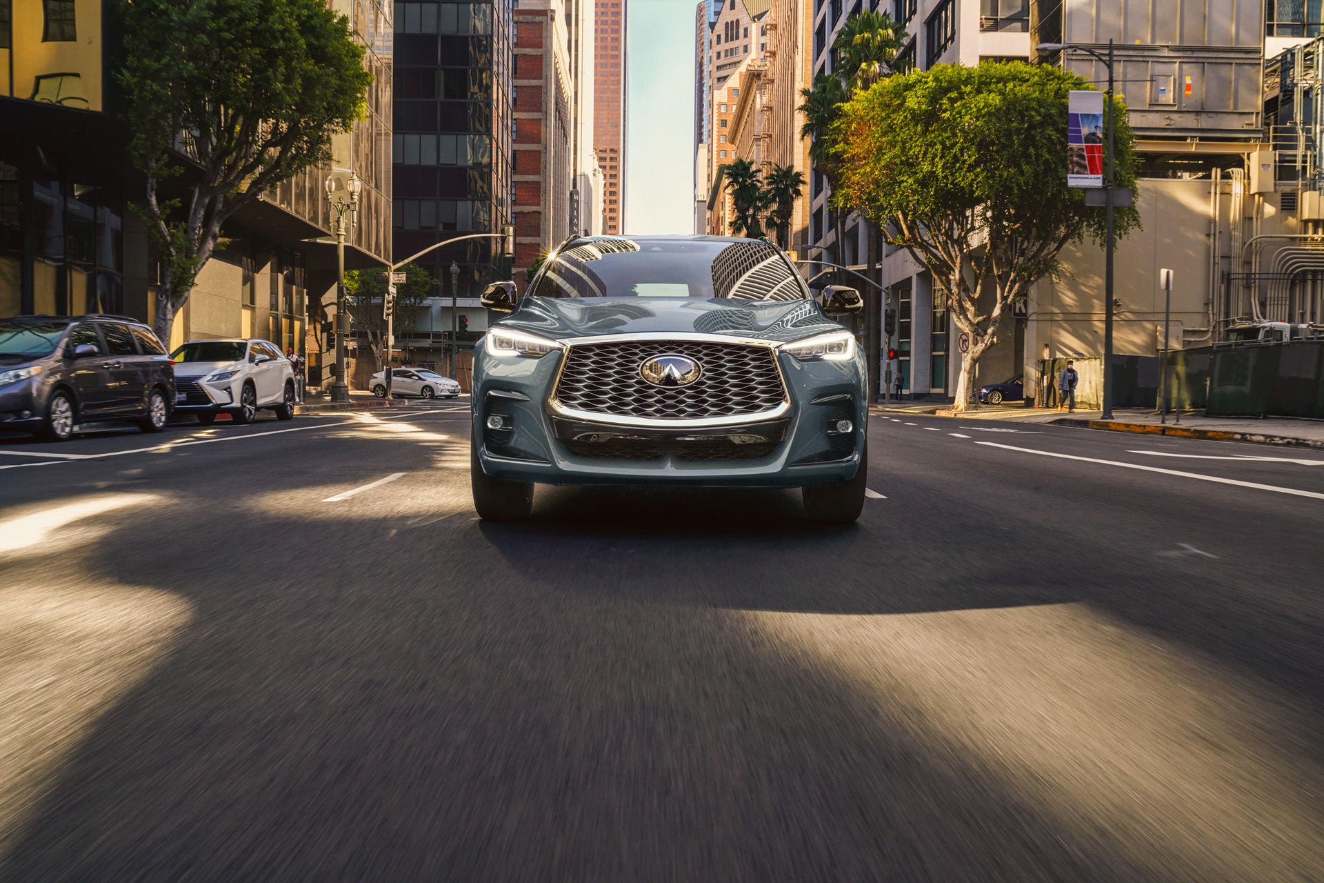 All those people looking at your eye-catching QX55 every crosswalk? QX55 is looking right back, providing driving confidence with standard-equipped Forward Emergency Braking with Pedestrian Detection technology.[*]