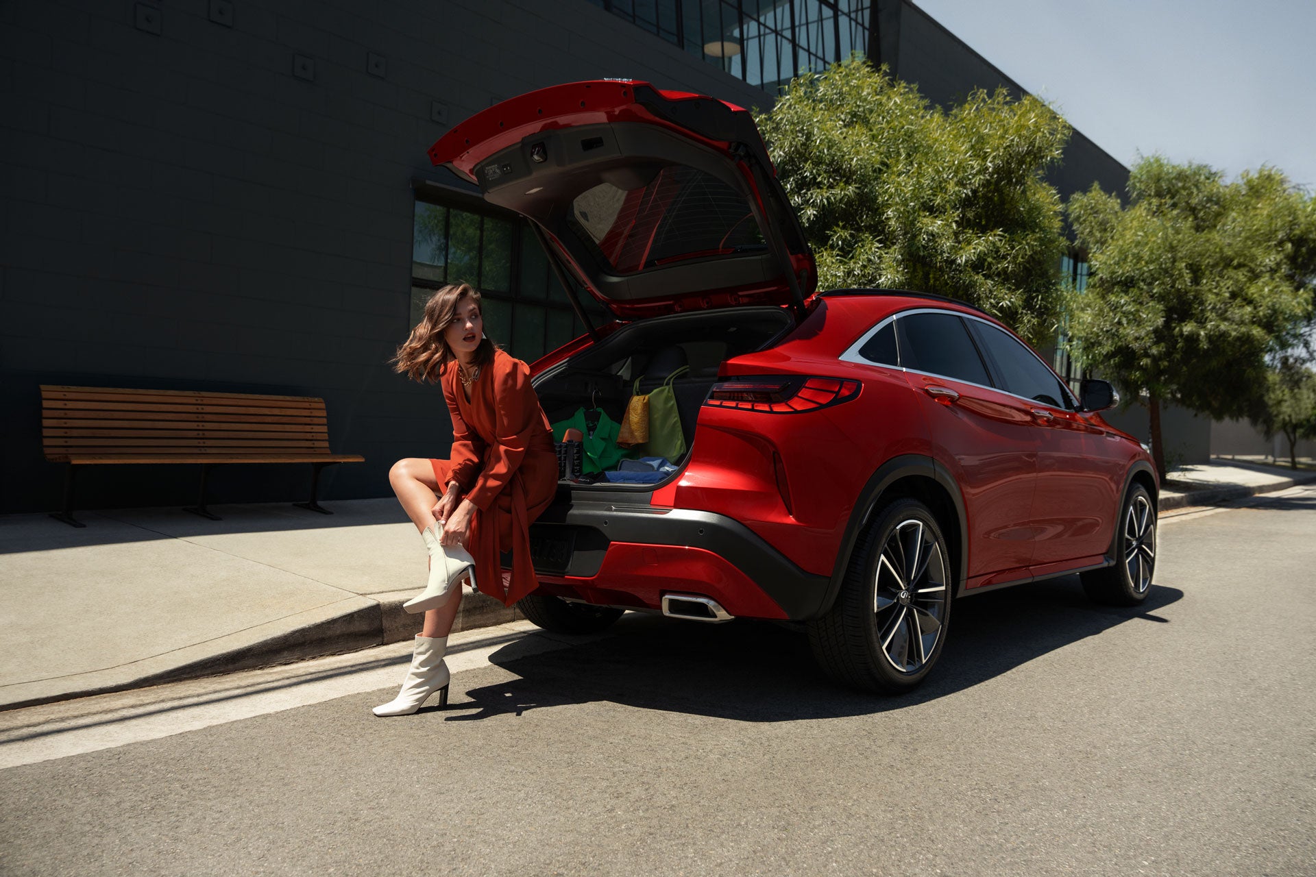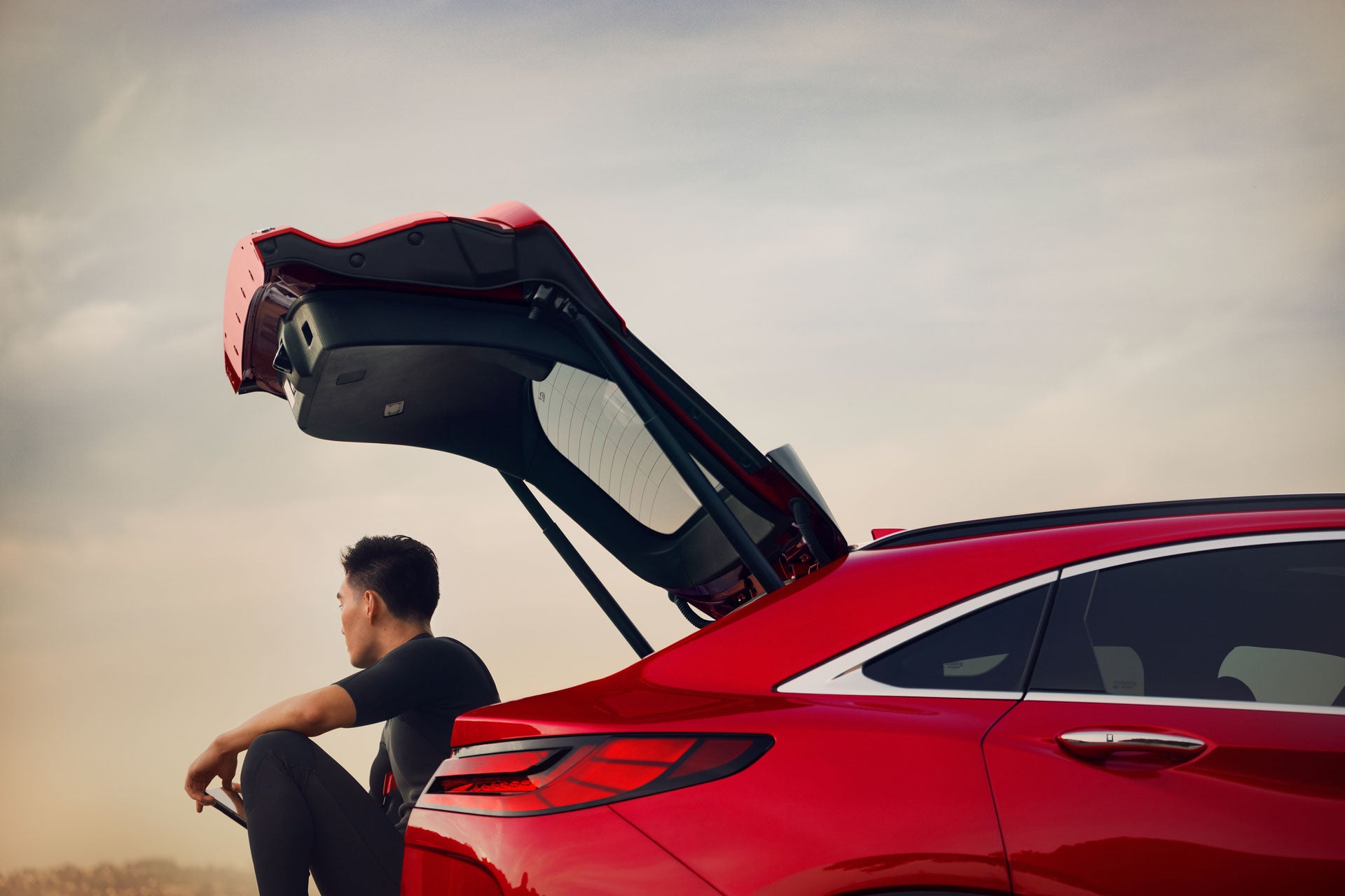A touch of QX55’s badge-integrated liftgate latch reveals ample rear cargo space supported further by robust underfloor storage and conveniently sliding rear-row seats.[*]