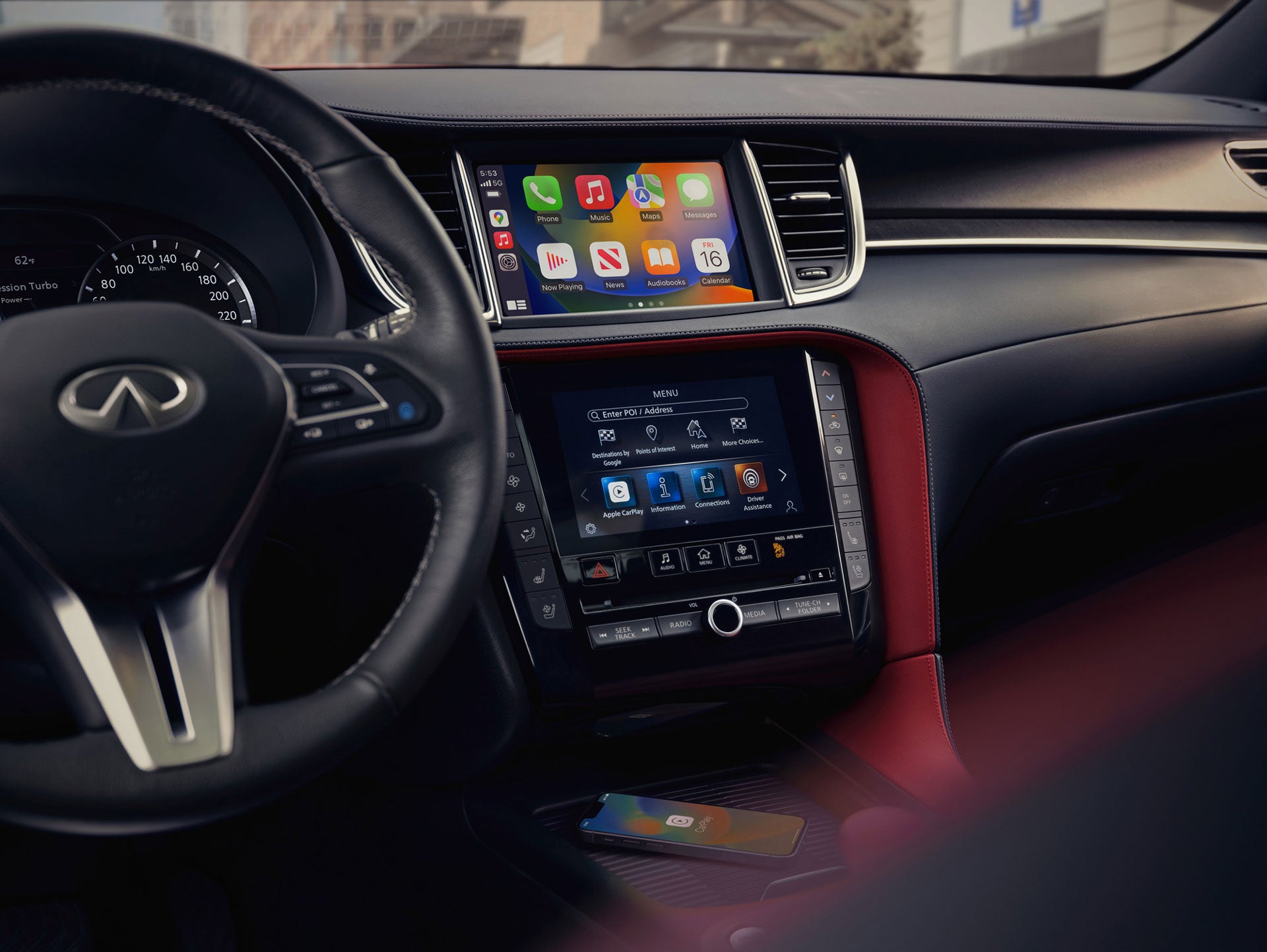 Wireless Apple CarPlay–Feature availability is dependent on vehicle model, trim level, packaging and options. Trial included with vehicle purchase. Compatible connected device may be required and feature availability may be dependent on device’s capability. Refer to connected device’s owner’s manual for details. Late availability for some features. Driving is serious business and requires your full attention. Only use features and connected devices when safe and legal to do so. Some features, including automatic crash notification and SOS, are dependent upon the telematics device being in operative condition, its ability to connect to a wireless network, compatible wireless network availability, navigation map data and GPS satellite signal receptions, the absence of which can limit or prevent the ability to reach Customer Care or receive support. GPS mapping may not be detailed in all areas or reflect current road status. Never program GPS while driving. Only use Remote Engine Start and Remote Horn features in accordance with any laws, rules or ordinances in effect in your vehicle’s location. Some services and features are provided by and dependent on third party service providers and not INFINITI. Should such service providers terminate or restrict service or features, service or features may be suspended or terminated without notice or with no liability to INFINITI or its partners or agents. Services and features may require compatible cellular network provided by independent companies not within INFINITI or its partners’ or agents’ control. Cellular network signal strength may vary and may not be available in all areas or at all times. Services and features may not function if cellular network is unavailable, restricted, or terminated. INFINITI and its partners or agents are not responsible for associated costs or other third-party changes that may be required for continued operation due to cellular network unavailability, restriction, or termination (including equipment replacements/upgrades, if available, or roaming charges on alternative networks). Technology is evolving, and changes by independent companies are not within INFINITI’s or its partners’ or agents’ control. Enrollment, owner consent, personal identification number (PIN), and subscription agreement may be required to receive full suite of features and services. Trial periods (if applicable) begin on the date of vehicle purchase or lease of a new INFINITI. Trial periods and feature availability may be subject to change at any time and may be subject to early termination without notice. Required subscriptions may be sold separately for each available feature or service after trial period ends, and may continue until you call service provider to cancel. Installation costs, one-time activation fee, other fees and taxes may apply. Fees and programming subject to change. Feature may be subject to age restrictions in some areas. Subscriptions governed by service provider’s subscription agreement, terms and conditions and privacy statements available at service provider’s website. Text rates or data usage may apply. INFINITI InTouch™ with WiFi terms and conditions of subscriber agreement apply. Included with vehicle purchase 1 GB or 30 Day Trial on equipped new INFINITI vehicles. Once your vehicle has exceeded the coverage parameters of the roadside assistance benefits included with your vehicle purchase, you will be responsible for any charges incurred by obtaining roadside assistance for your vehicle. For complete information concerning warranty coverage, conditions and exclusions, please see your INFINITI dealer and read the warranty information booklet. The INFINITI names, logos and slogans are trademarks owned by or licensed to Nissan Motor Co. Ltd. or its North American subsidiaries. Other trademarks and trade names are those of their respective owners. For important safety information, system limitations, and additional operating and feature information, see dealer, owner’s manual, or https://www.infinitiusa.com/intouch/legal.html.