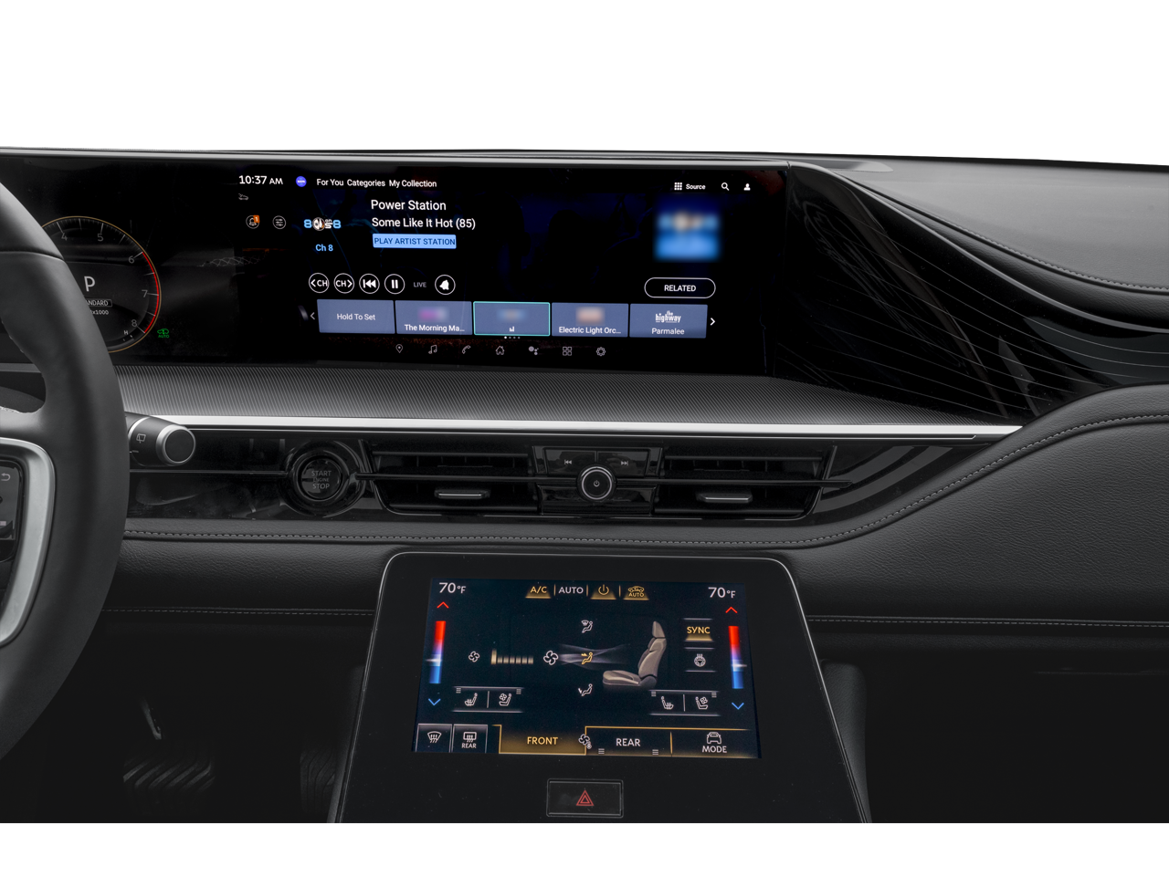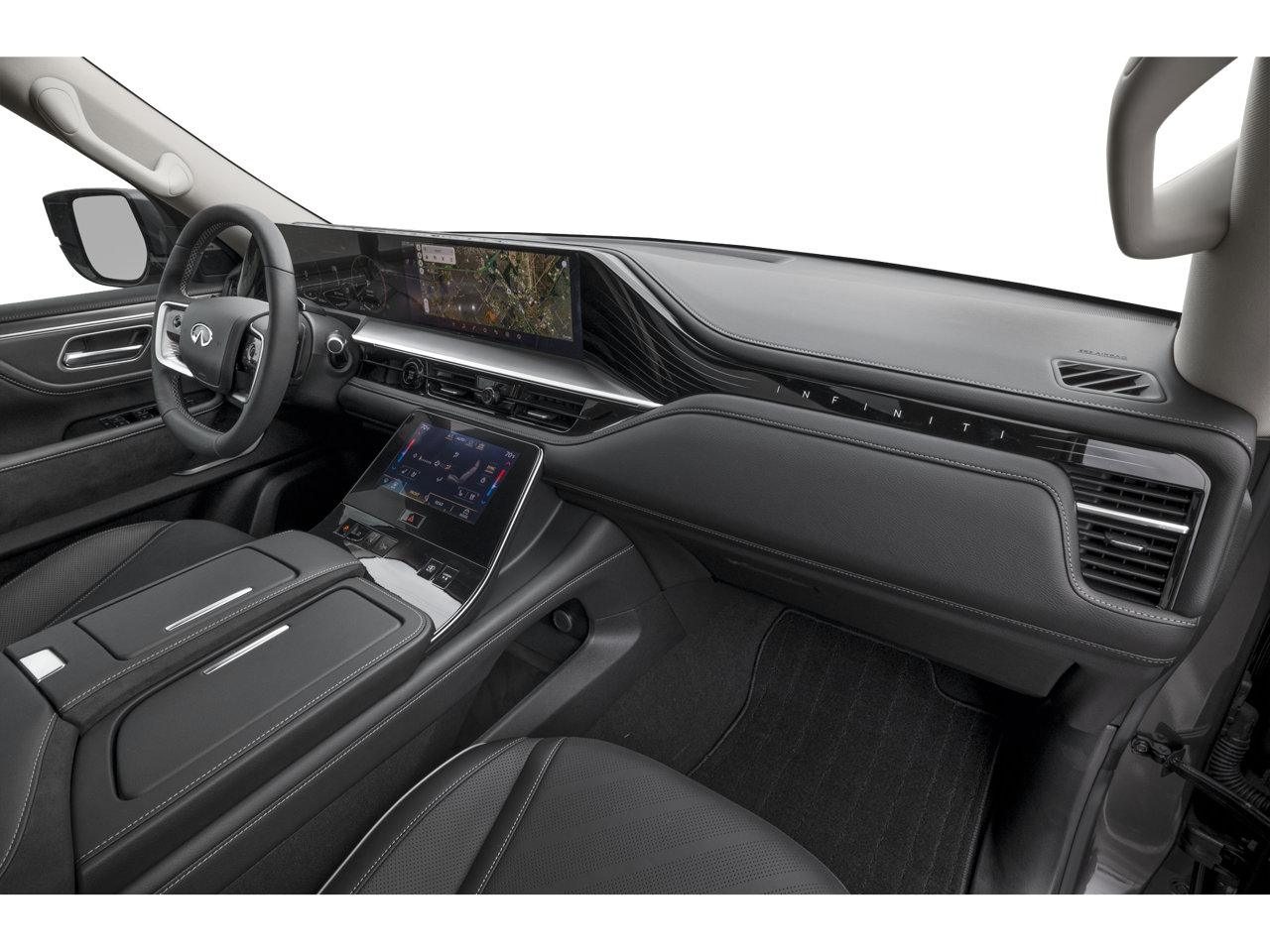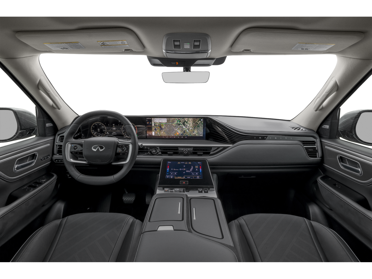 - Radio: Klipsch Premium Audio System -inc: 14 speakers w/Active Sound Enhancement (ASE), demo mode, dual 14.3" infotainment screens w/front control panel, Google built-in w/navigation, Amazon Alexa w/hotword, Bluetooth® hands free phone and audio streaming, wireless Apple CarPlay and Android Auto, hybrid radio, SiriusXM w/360L, INFINITI InTouch services, 5G Wi-Fi hotspot and 2 USB type-C media ports w/iPod interface